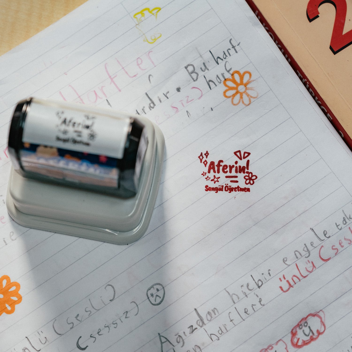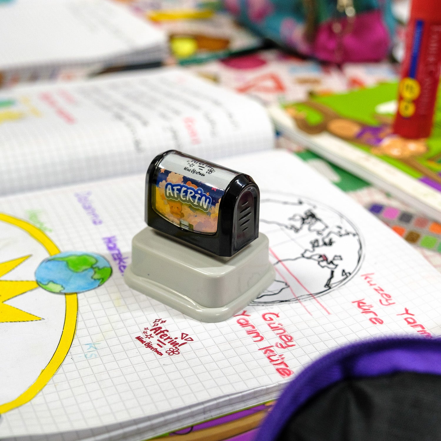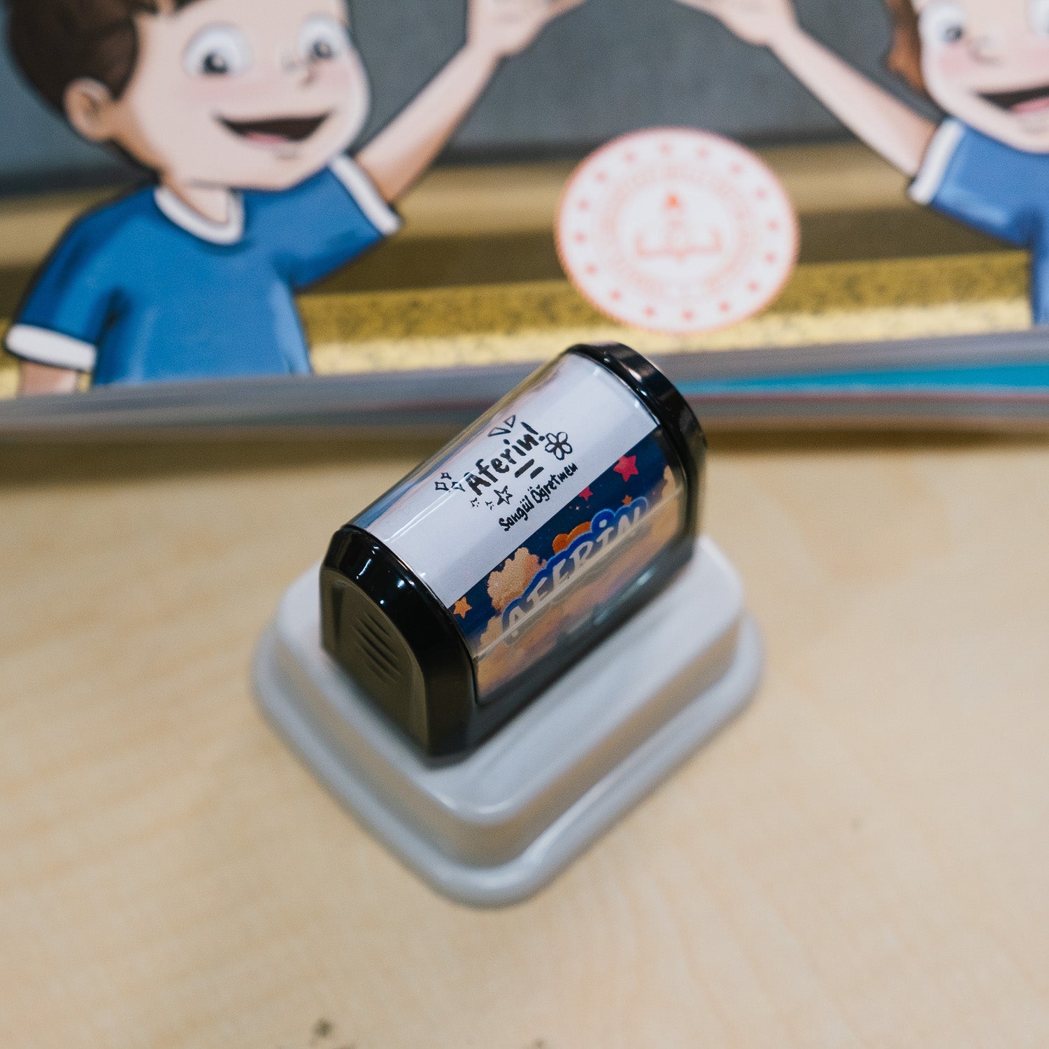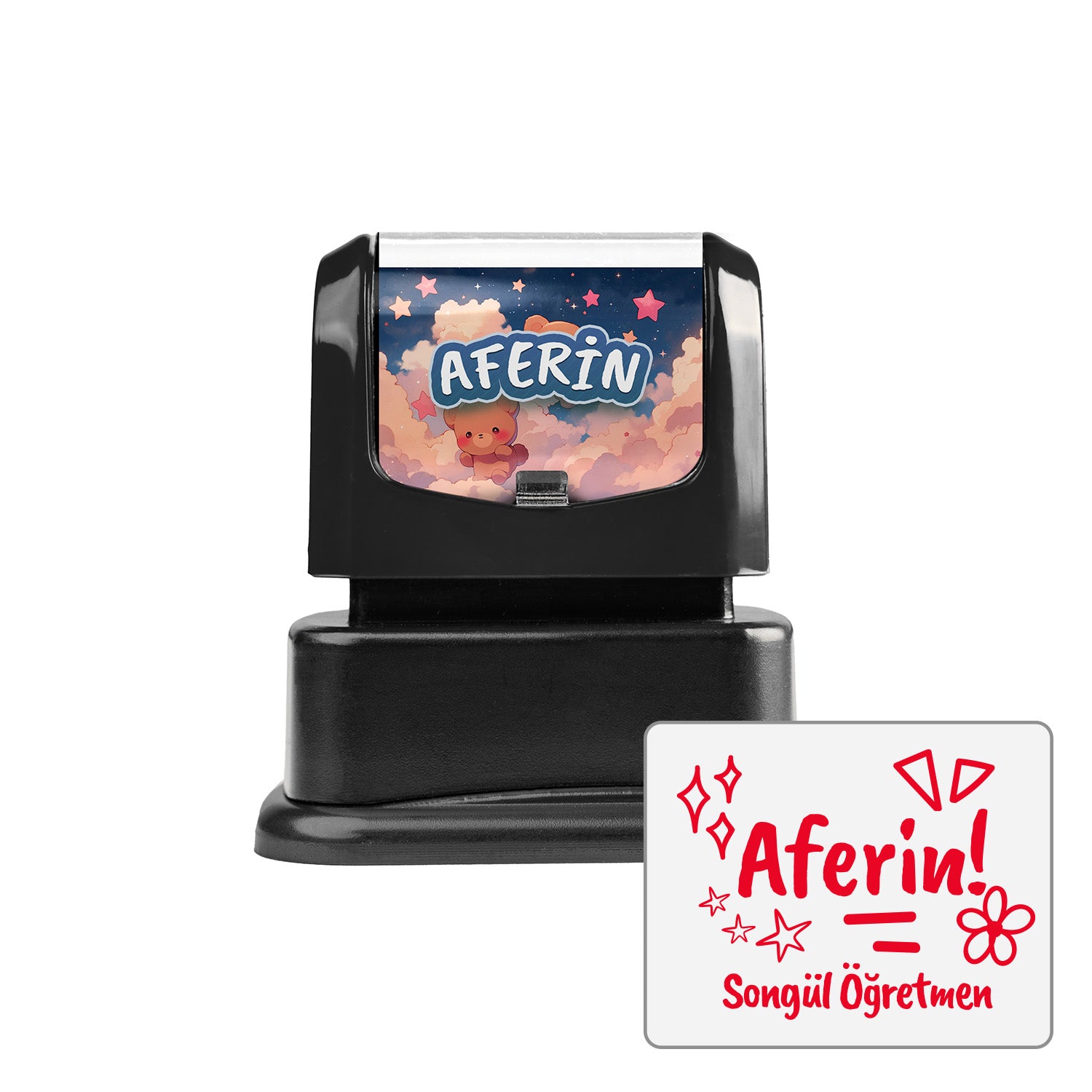 Öğrencilerin başarısını takdir etmek için en keyifli yol! Bu kişiye özel “Aferin” öğretmen kaşesi, üzerine sadece öğretmenin adı eklenerek hazırlanır. “Songül Öğretmen’den Aferin” ya da “Ali Öğretmen’den Aferin” gibi isimli baskılarla öğrencilerin motivasyonu artar. Dayanıklı gövdesi ve canlı renkli mürekkebiyle uzun süre kullanılabilir.
